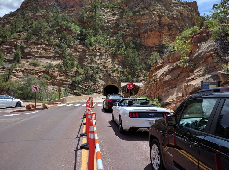 路上要经过一个狭长的山洞(大约1.6公里)。只能单向行驶。所以得排队等候。