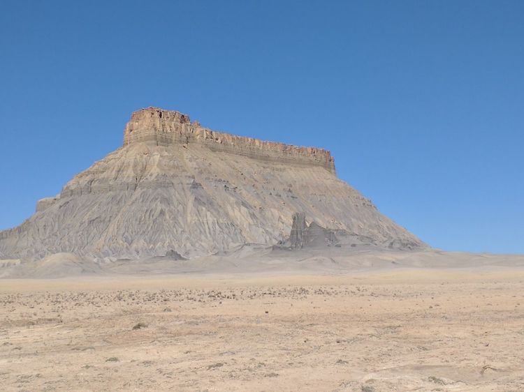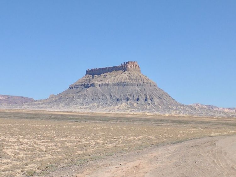 早上我们沿着24号公路经过公园后又往东开了25英里左右,在左边会看到这样一座非常奇特, 孤零零的山丘(Factory Butte)。往左拐进一简易公路可到近处观赏。象不象一座高大的城墙?