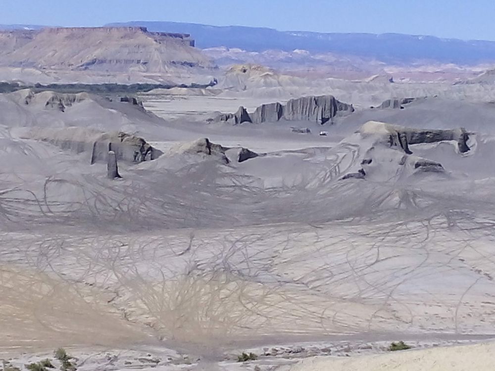 看完Factory Butte后回头。路边有一简易厕所。附近似乎还有什么东西可看。往西边开进500米左右,看到下面有天然的赛车场。一群摩托车手正在这里赛车。