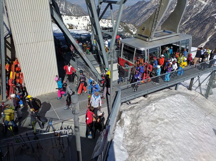 滑雪爱好者全副武装,正走出缆车。我们什么装备都没有,看热闹来的。