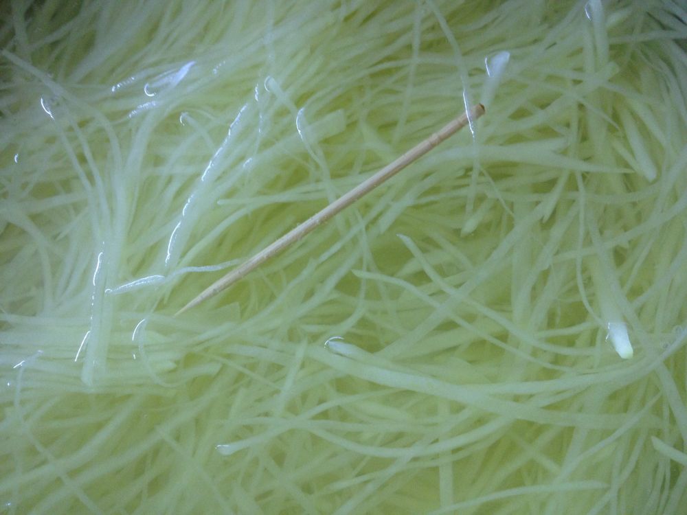 美国人也很喜欢吃土豆,烤整的,煮切块的,炸条的,独独没有华人爱的土豆丝,个人认为主要是他们的刀具不适合切丝,只有华人的大片刀能。为了把土豆丝切细,我也是很练了一阵,天天切,搞得家里人都吃腻了。华人特别是四川人做土豆丝的方法颇多,清炒,炝炒,过水拌凉菜,煎饼,等等。我最喜欢炝炒和用酱油炒两种。昨晚 ,用了三个黄皮土豆,切了一大筐,以前自吹说能从筐眼里漏出去,信的人少,这次放了根牙签做参照物,看看多细。切得细,土豆丝越是容易过心熟,口感越是脆脆的。要切得细,就要会用大片刀,而且是用刀与砧板平行把土豆片成半透明的薄片,再切出来的,那种切法叫擦手切法。