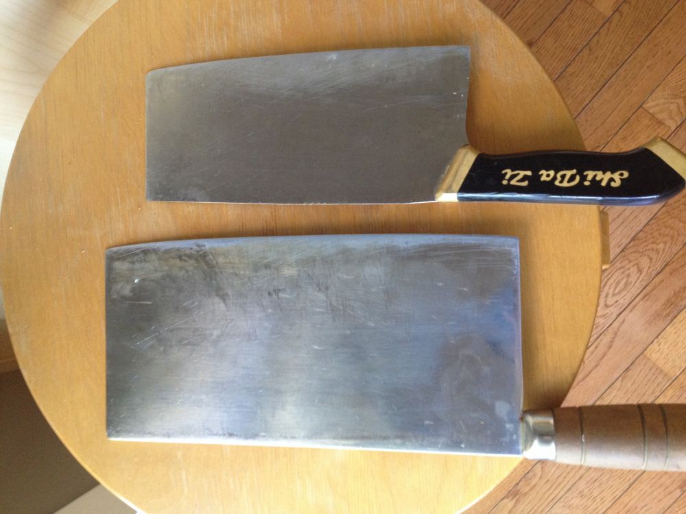 。。。。。。看看片刀和普通厨房用刀,上边的就是片刀,下边的是普通厨房用刀。”