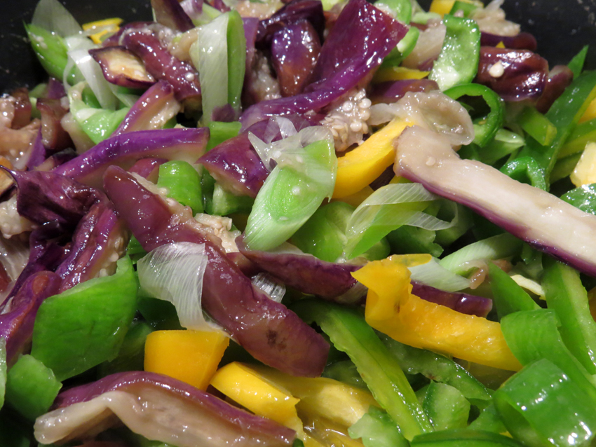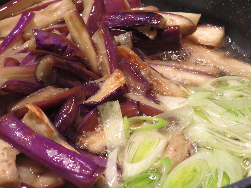 做法:茄子洗净切段,用盐腌制15分钟,把出来的黑色水去掉,放到锅里炒尽水,加油焖,加葱炒香: