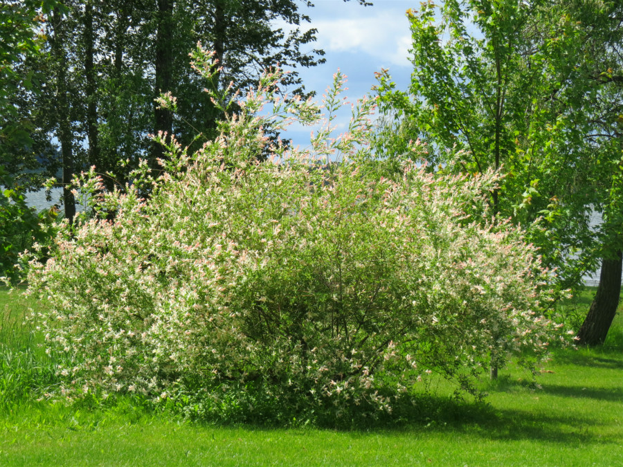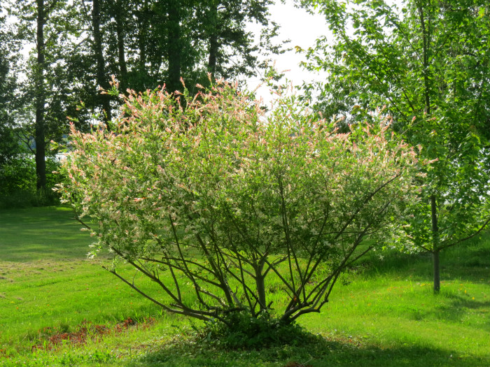对花叶柳的喜爱,真可谓是一见钟情。这种灌丛的叶子绿中带粉白,非常好看,看看这棵没有修理时的样子: