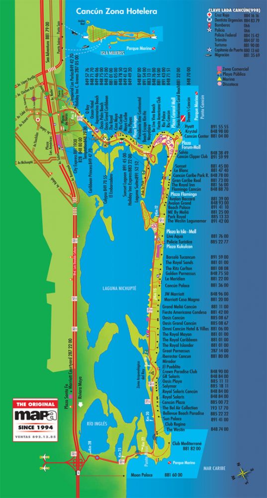 严格地说坎昆是一个很小的城市。坎昆传统的旅游区在加勒比海和汤湖之间的自然形成的大堤上。大堤成环形,像一把钥匙。坎昆的旅馆多数在这个大钥匙上。大堤东面是浩瀚的的加勒比海。大堤和陆地之间是平静和湛蓝的汤湖 。汤湖是一种礁湖,即在海湾边上由礁岛环绕了湖泊。