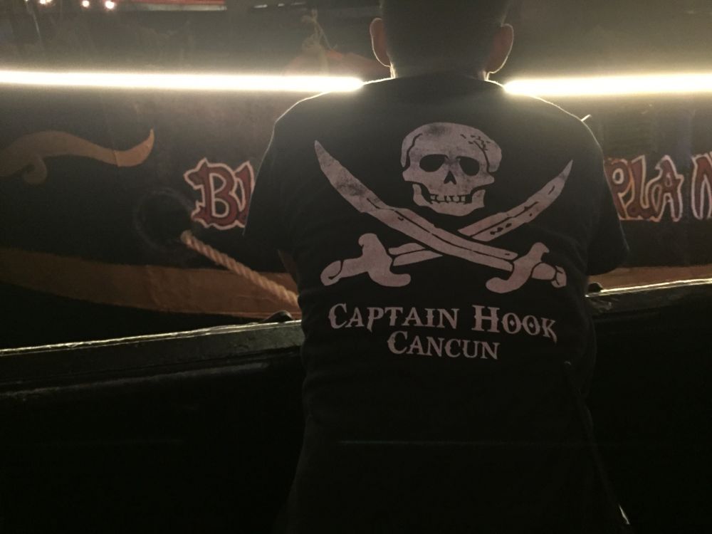 游船按照当年加勒比海的海盗船来装饰。船上的服务员全部都打扮成大小海盗罗罗们,我们船上还专门找了个侏儒人,他也打扮成海盗。一共有三只船,八点半徐徐开往离坎昆不远的海面上。船上的一个主持装扮成大海盗 库克船长Captain Cook,独眼龙,几个小时不停的说和出节目。伴随着震耳的拉丁美洲的音乐,船上的海盗罗罗们不停地为我们送啤酒喝。