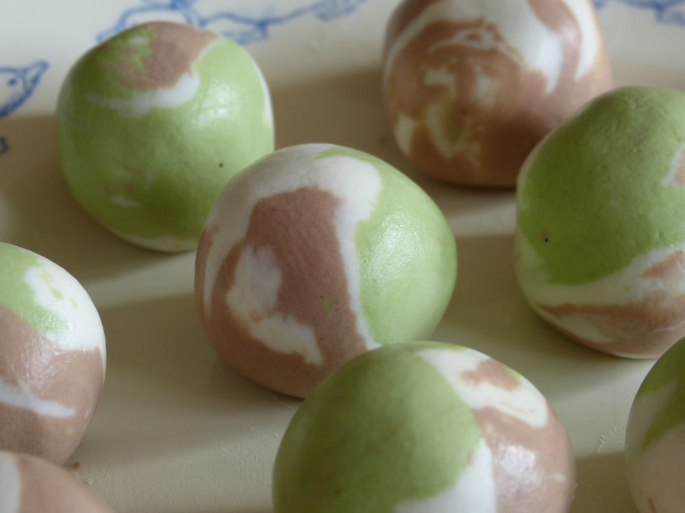 做法和普通汤圆一样,只是把和好的糯米粉团分成三份:把其中两份,一份加抹茶粉捏匀,另一份加可可粉捏匀,把白色,绿色和咖啡色混在一起,稍捏几下即可。