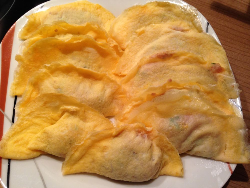 刚包好的样子: 煮熟后的颜色更加鲜艳好看: 咬一口,甜糯香: 前几天做了蛋饺,很费事,但很好吃。多做一些冷冻在冰箱里,做汤的时候,放上几个,味道很鲜美。