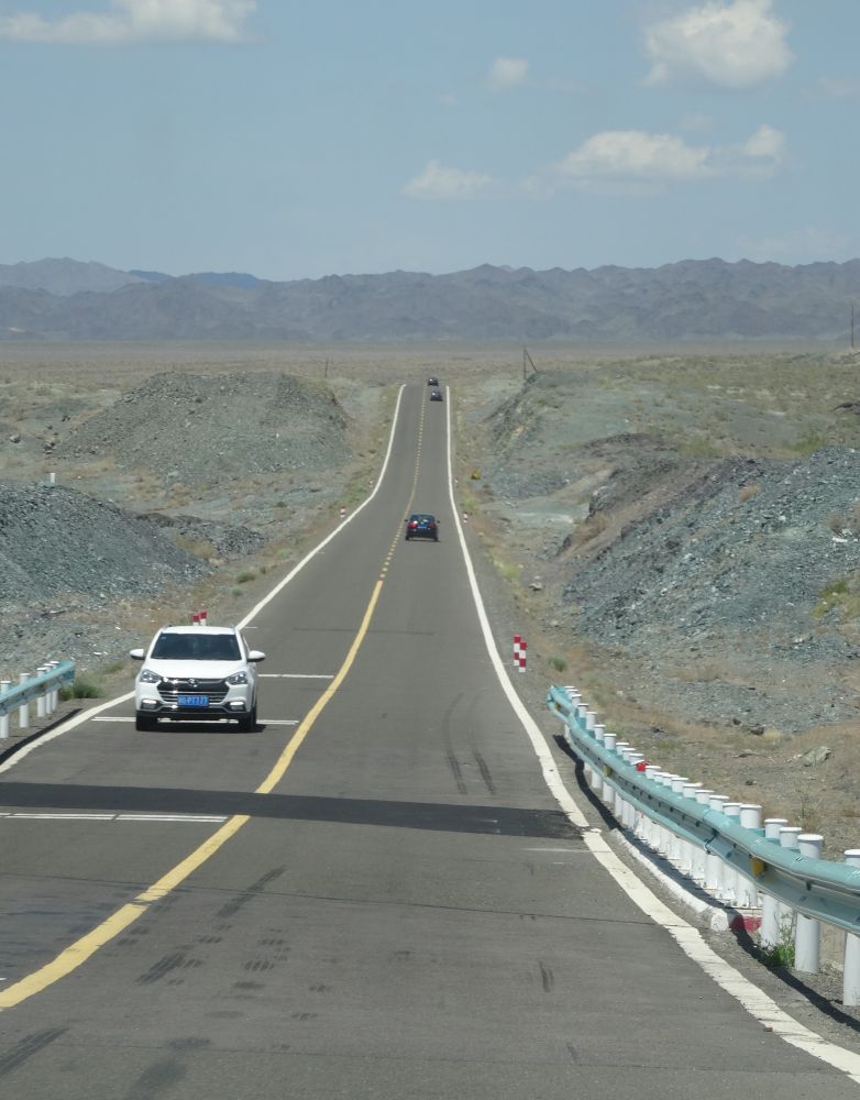 车队前行,看到的是辽阔而单调的荒漠远山。濒临湖面萎缩的盐湖艾比湖在公路的右边,强烈的阳光晃眼,我们没有靠近。