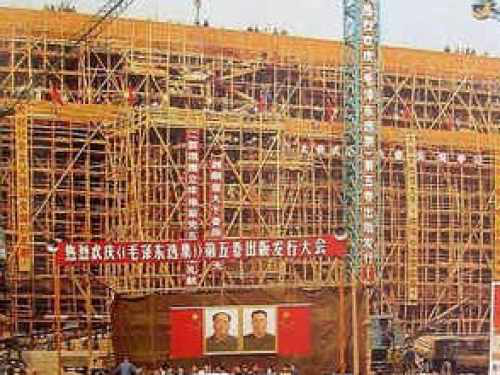 渐渐地,从76年十二月份以后到次年开春,广场内一栋巨大的建筑物在不断长高加大。密密麻麻的脚手架搭满全身。很长一段时间内,看不出这建筑物长的啥样子。