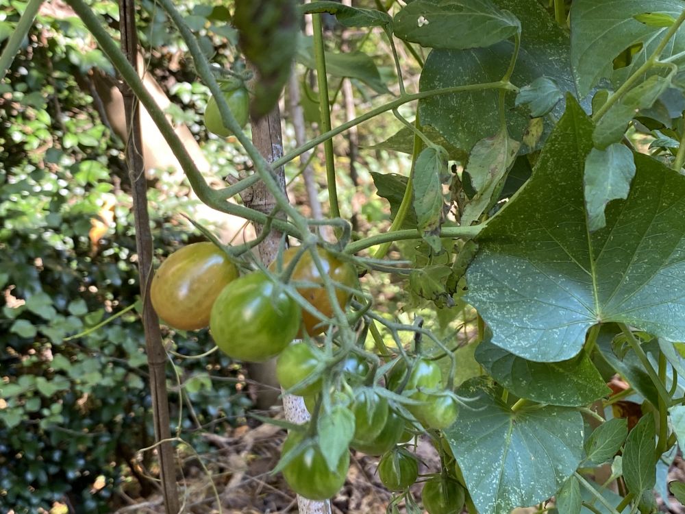 整整一个夏天,因为那些花蚊子太厉害了,我很少来到后院,菜地里的菜就靠天靠地自由疯长。小西红柿表现优异,一直有红红的小灯笼不间断地挂在绿枝条上,所以会冲出去摘下来尝鲜。埋在地里的红薯看不见,但是红薯的叶子长得一蓬蓬枝繁叶茂。现在,是到了品味秋天的时候了。