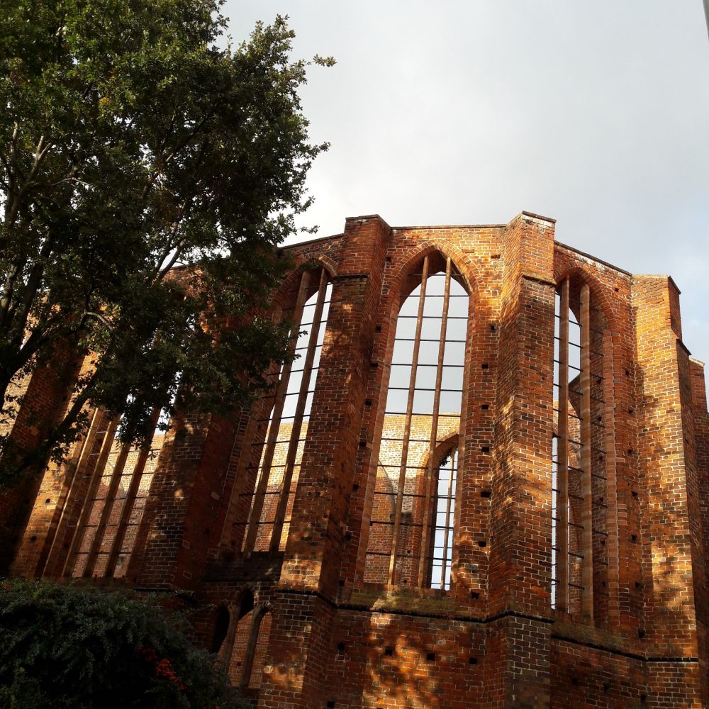 我随意乱逛,走到一片废墟。以前是st. Johannis 修道院,当年条顿骑士团也在此扎营,他们的训练团在这里。非常古老,面积很大,狭长,和城墙连在一起。 19世纪一场大火,二战又遭盟军空袭,被彻底摧毁,现在只剩了残垣断壁和小房子。