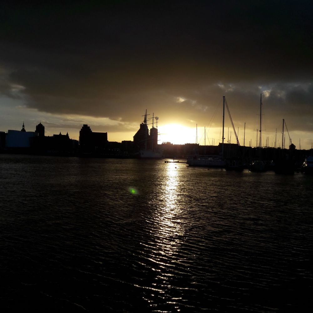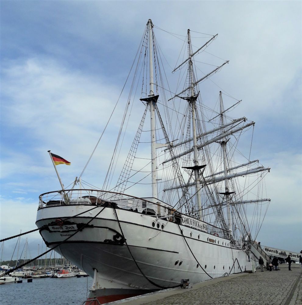 走到港口。这里有停靠在海港边的Gorch Fock号。这艘海军名船在1945年4月底的二战中不幸中弹,后经苏联维修后一直服役到2003年。后来停靠在这里,作为一艘海军教学船,同时也供游人参观。