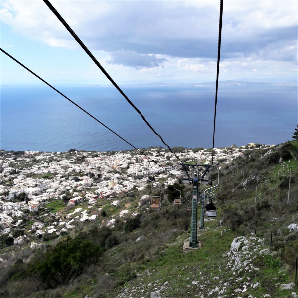Anacapri镇有卡普里岛的最高点,Monte Solaro, 坐空中缆车,其实就是一把空中椅子上山。