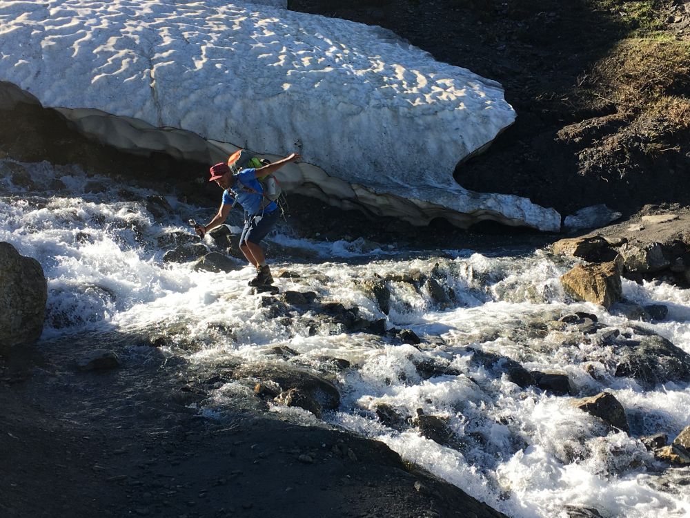 天热出汗多,我们的水喝完了,好在遇到了瀑布,赶紧加水吧。美国出生的孩子不肯喝野外的水,说会拉肚子的,我稳稳地回答,不怕,我带了拉肚子的药。其实心里知道,这种干净的雪水,拉肚子的可能性很小。