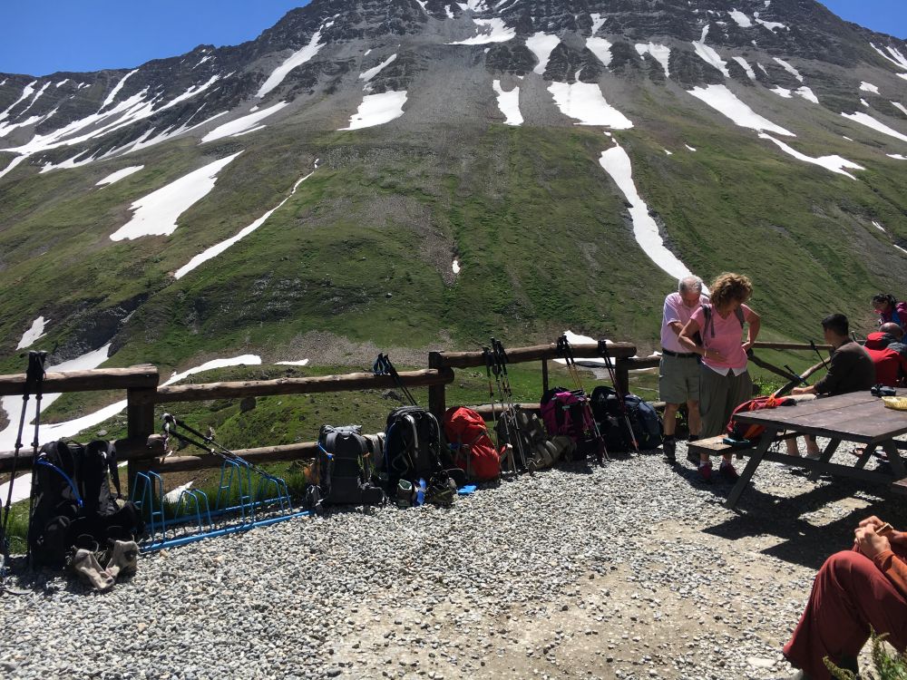我们是比较原始的方法,自己背东西、自己订(呵呵,实际上是没订)住宿,也没导游。坐飞机时登山杖和多用刀一定要托运,我就找了个旧箱子装,到了日内瓦把旧箱子扔了。大多数人把不用的东西留在大本营比如霞慕尼的旅馆里,回头再拿,但我们出发和结束不是一个城市,所以十多天里所有的家当都在自己肩上。以前看照片,我总是吃惊为什么有些不露营的人也背那么大个包,我决心做一个简约主义者,尽量少背东西。可是真正装包时才发现理想和现实还是有点距离滴,结果我的32升的包也装得鼓鼓的。