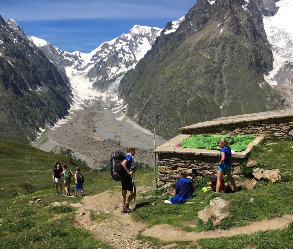 孩子们待了一个小时20分钟还不想走,终于12:20恋恋不舍地离开网络,下山。勃朗峰四周环绕着五条山谷,这条TMB虽说是在对面半山腰上行走,实际上是几乎每天爬上山,然后常常又下到谷底,从高度上看,属于做无用功。