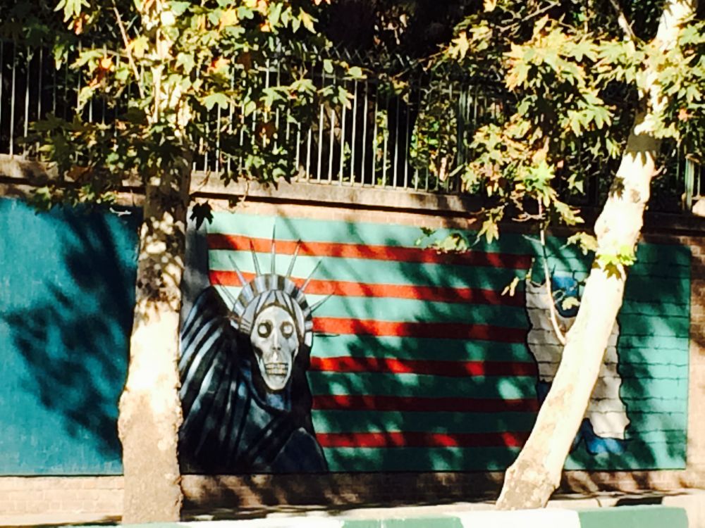去车站的路上,应我的要求,Soya阿姨给出租车司机交代好要到前美国大使馆溜达一圈。虽然她开车已经带我路过了这里,但我的确没看见那著名的壁画。Kam叔叔的大哥家就在大使馆旁边,但是他因为不在家,要不阿姨打算带我直接去他家里俯瞰。:)专车司机也是个实诚人,生怕我这个角度没看好,那个角度没拍好(当然,坐车里不下去的确也拍不到特别清晰的照片,但我实在不愿过马路了)。就这样,我来到了德黑兰火车站,准备去著名的葡萄酒古都Shiraz了。。。。。。