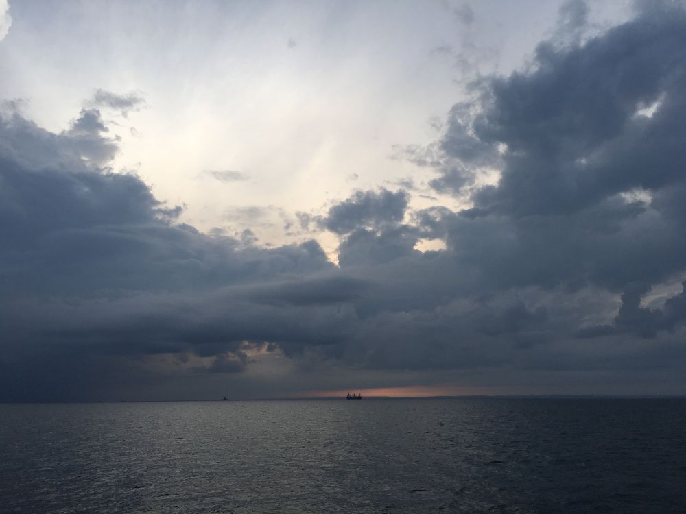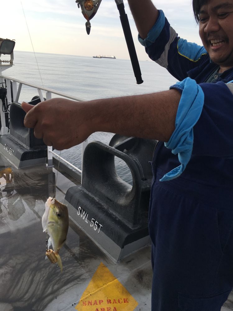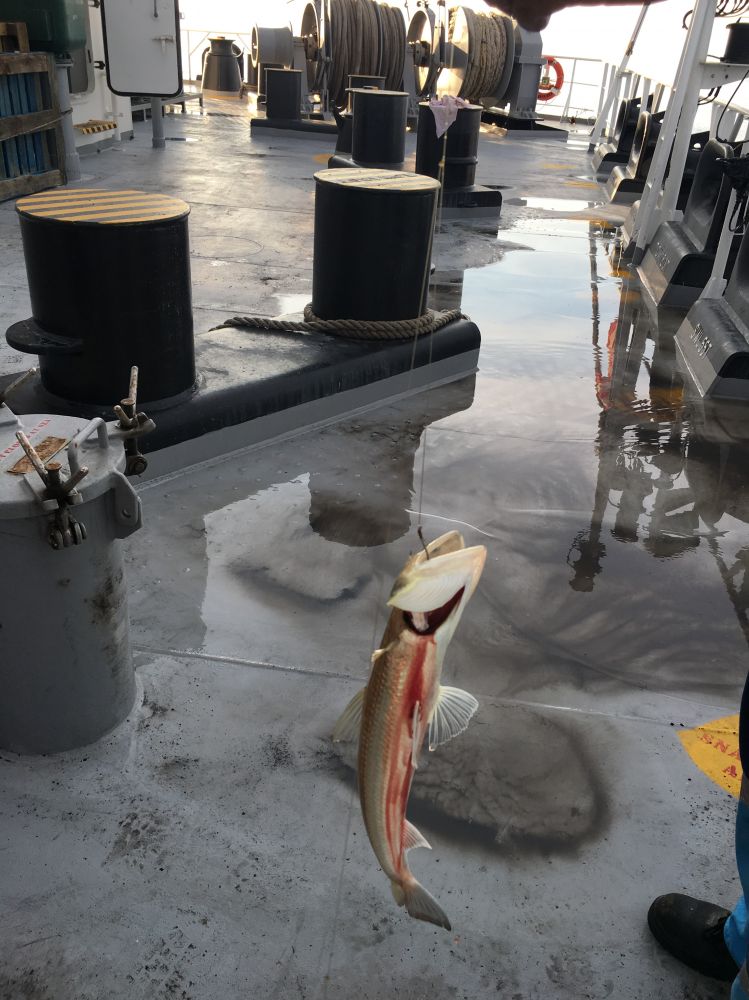 抛锚后,船员开始钓鱼,有点血腥~~~~~第一杆 下去,仨鱼钩只剩下一个,鱼线都咬断了~~~
