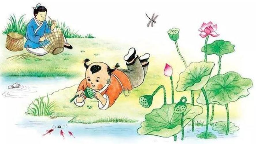 大儿子在溪东边的豆田锄草,二儿子正忙于编织鸡笼。最令人喜爱的是小儿子,他正横卧在溪头草丛,剥着刚摘下的莲蓬。