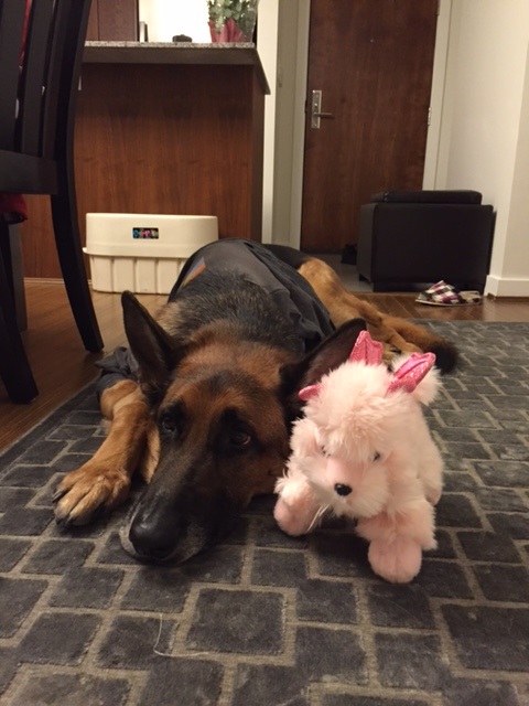我们给米卡订了个外出徒步用的harness,明天可以到。等待的时间里,米卡的聪明麻麻给他改装了一下现有的harness,固定了胸口的那块板,这样我可以帮助米卡走路,卸掉他一部分体重。