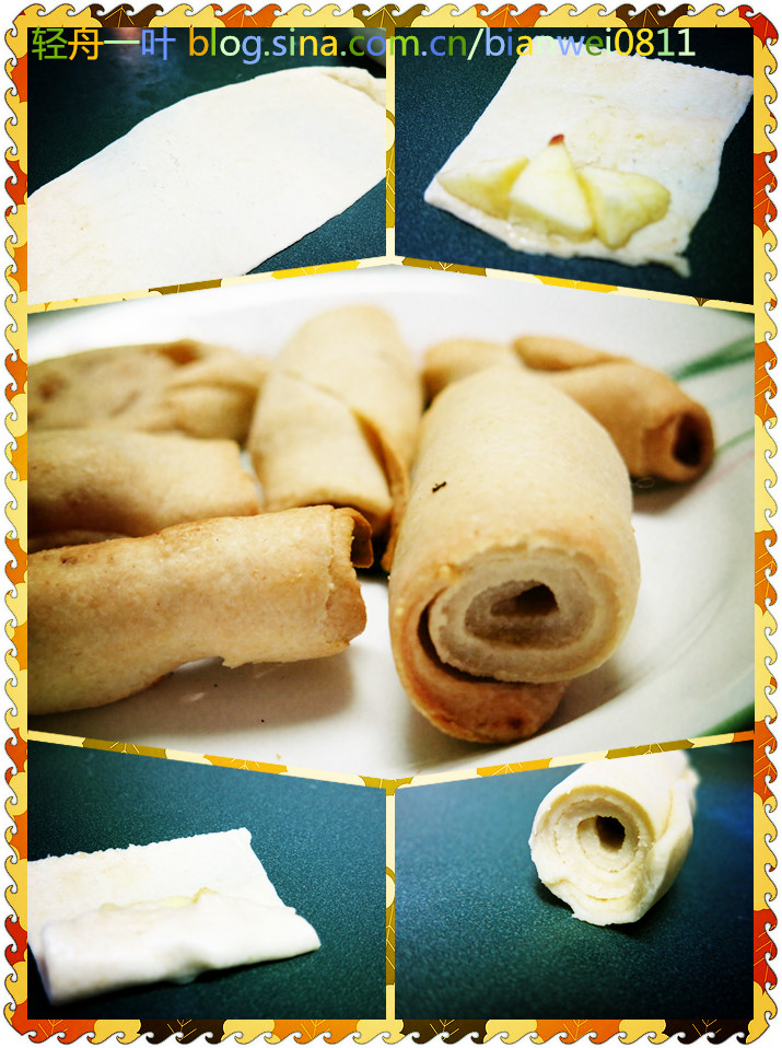 女儿用剩余的面团和苹果块做了苹果卷 (350华氏度烤15-20分钟, 外酥内软,一级棒的小点心呢!)