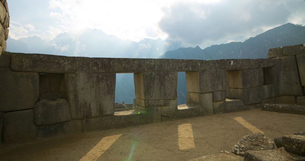 太阳神庙,是一个马蹄形建筑,坐落在一块天然大石上。神殿和大石连接的如此精妙,实无一隙可观。半圆形的石壁上面东开一窗,每年的6月24日,第一道冬至的曙光,就会直穿入室,与石上雕刻的直线平行,告示族人们节气到了。三窗庙则位于太阳神庙旁,因有三扇巨石叠成的梯形大窗而得名。三窗一线,庙中央立有一根笔直的长方形石柱,石柱边还有一块阶梯石刻,土人说,这三窗寓意着过去,现在和将来。