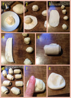 2.5杯面粉加一杯水,一点点盐,一勺糖,一小勺yeast做的发面, 分20份, 发面大概30克一份