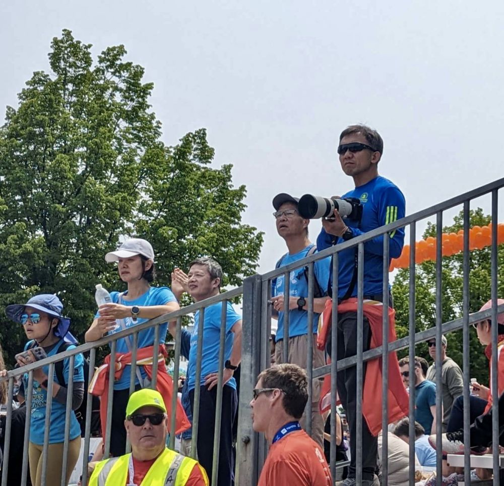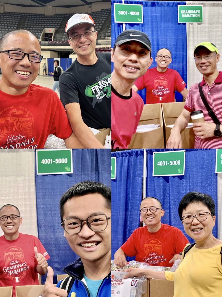 照片4: 此行非常感谢雪狼参赛的跑友、摄影师和啦啦队,特别是谢谢今年1月来跑休斯顿马拉松认识的雪狼跑友张震拉我入了雪狼老奶奶马拉松群;他不仅在赛道做摄影师,而且周五做了一整天放发参赛package的志愿者。照片4是张震与领package的一部分雪狼参赛者的合影,从左至右和从上至下分别是Kan (老大)、Debin、Yongcong(丁队)、Youchi、和Yuqing(任教授)。