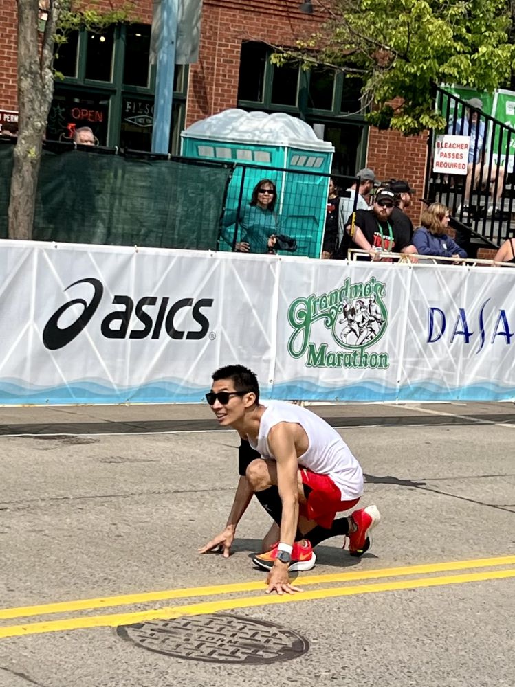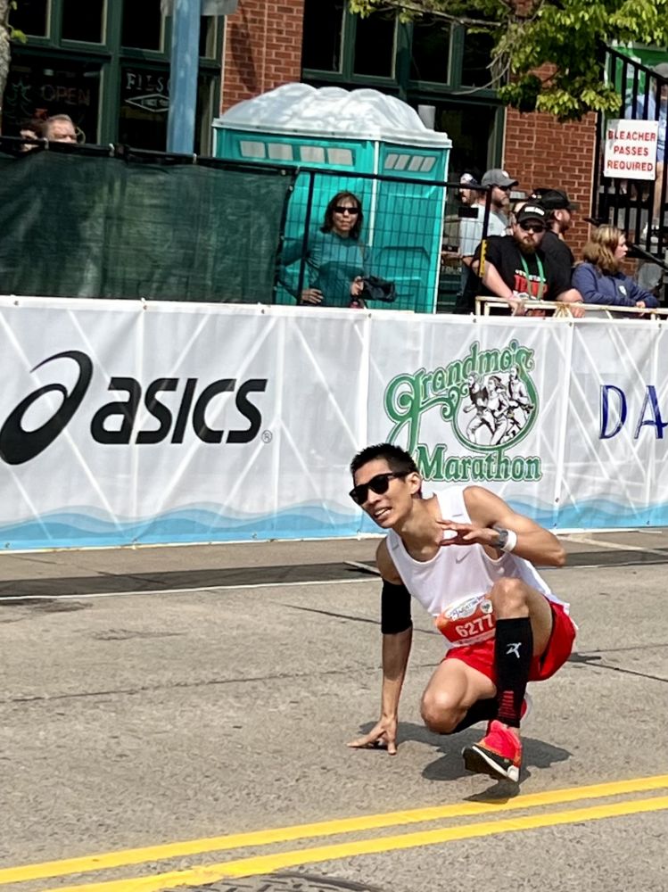 照片17: 冲刺终点的明州著名华人跑团雪狼跑友Kan(昵称“老大“),成绩2:55:31。