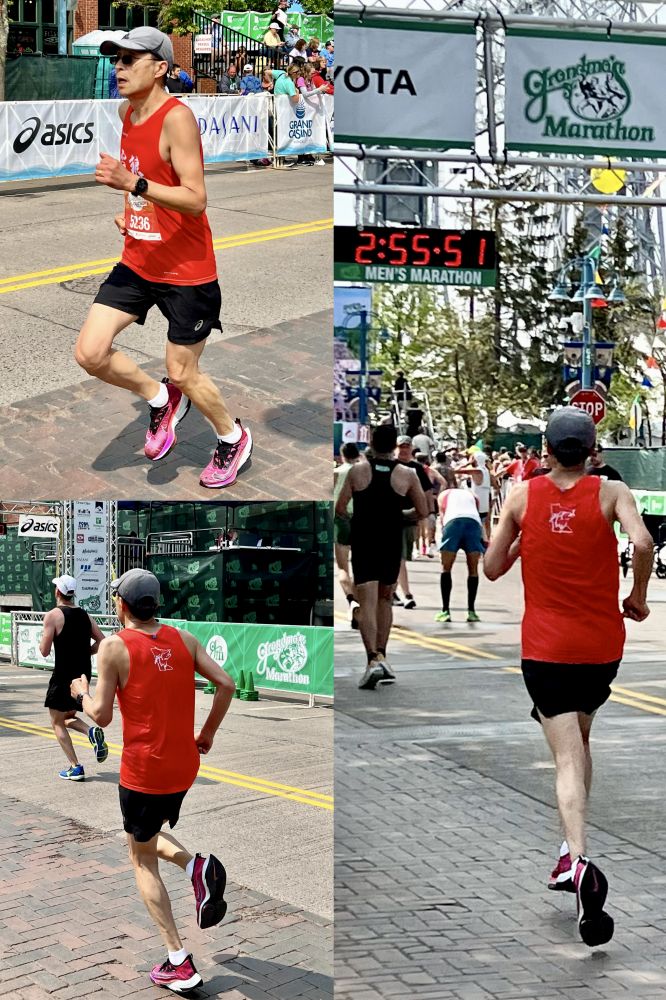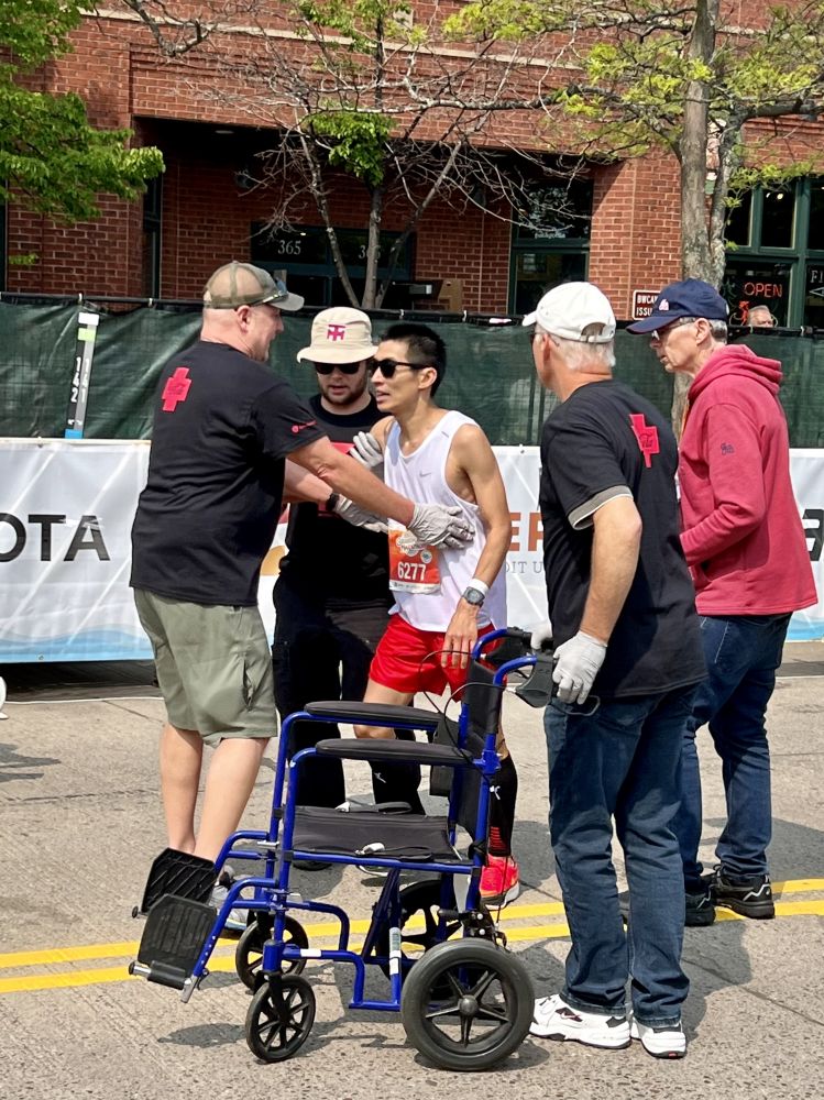 照片31-34: 先生在终点抓拍到一位跑得很快的亚裔参赛者在临近终点时看上去是突然双腿抽筋摔跤,离终点仅几米之遥。看到先生抓拍到那人抬头望着终点的神情(照片31-32),其中的不甘令我心痛得眼睛湿润了。终点现场工作人员拿来轮椅让他坐,但他拒绝了,而是在工作人员的搀扶下走过终点(照片33-34)。有“网络神探”之称的雪狼跑友Ming告诉我那是一位来自与我同一个城市的亚裔参赛者(姓Lim),最终芯片成绩是3:00:33。雪狼跑友Ming推测这位来自平原休斯顿的参赛者可能是缺少跑坡训练被奶奶/外婆线路上坡虐的。我觉得有可能,我的一位波马sub2:50的跑友从德州去跑奶奶/外婆马被虐得一塌糊涂,他说这个马拉松的rolling hills比波马糟多了;而另一位从德州来的跑友PR了,她说“谁说Grandma’s Marathon有rolling hills? 我怎么没感觉到“:-);真是因人而异。