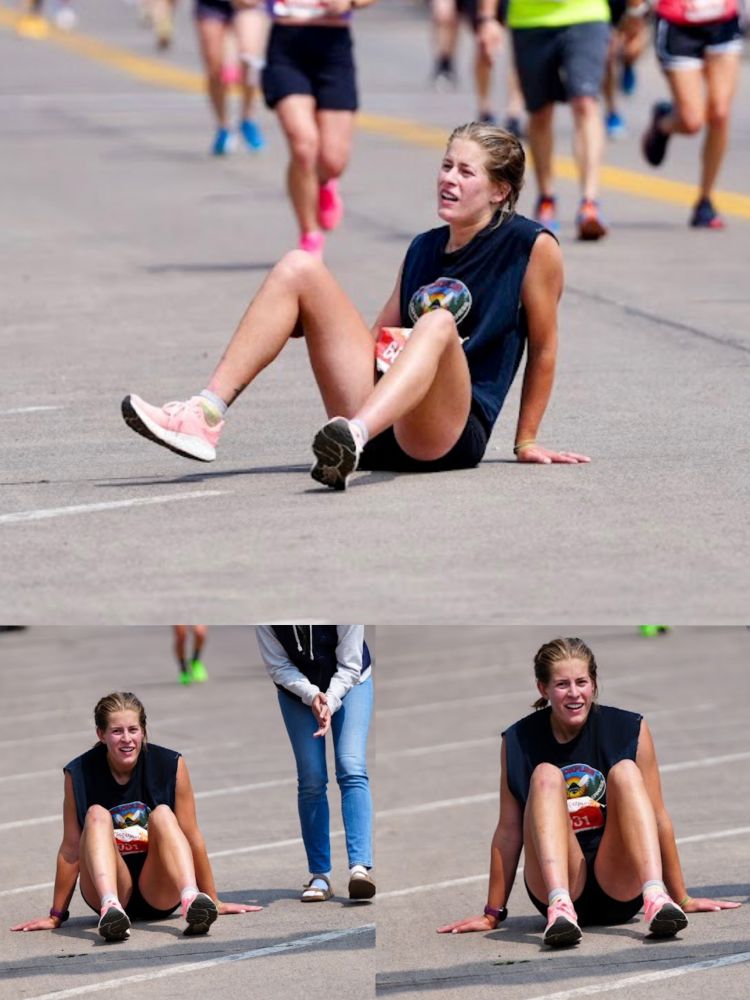 照片35: 雪狼摄影师王璟在终点抓拍到一位年轻女孩也是在接近终点时终于双腿也撑不住了,跌坐在地上;这位女孩拒绝了工作人员的搀扶,坐在地上慢慢挪过终点。我也被这位女孩感动得眼睛湿润了,上网查到这是一位来自科罗拉多丹佛的24岁年轻姑娘,最终成绩是3:36:47。