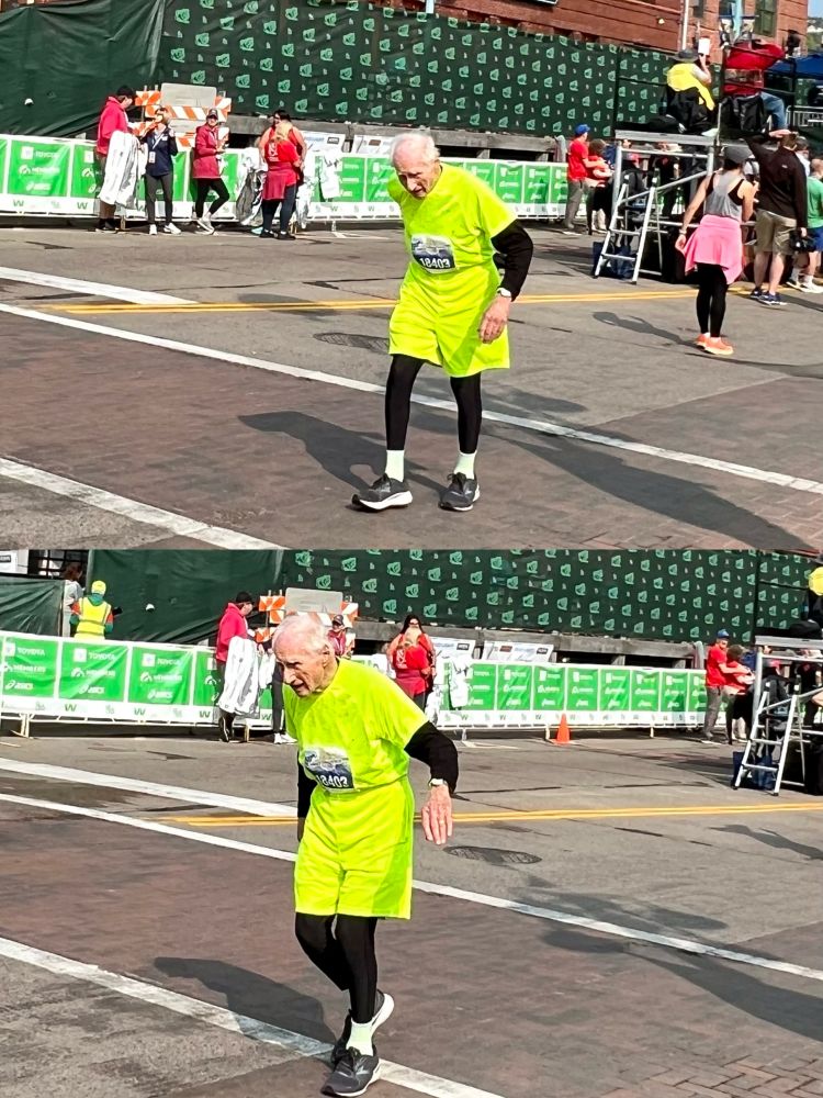 先生拍的以上这位老人家感人的参赛照片使我想起在大学校园宿舍里遇到住在我们隔壁的兄弟俩,他们居住的州与明尼苏达州相邻,60多岁的弟弟跑半马,主要是陪跑全马的71岁哥哥圆BQ(达标波士顿马拉松)之梦。周六参赛结束刚回校园宿舍楼,我和先生就遇到那位弟弟;一看到我和我先生,他就兴奋地告诉我们:“我哥哥BQ了,快42秒!我哥哥终于BQ了,第一次!”我和先生立即衷心地表示祝贺。那位弟弟表示了感谢之后,立即问我跑得如何;看到通常很低调的先生有点跃跃欲试想分享的样子,我立即悄悄地拉了一下他背后的衣服,抢着说:“很开心!沿途风景漂亮并且我们有许多朋友来加油,见到朋友们很开心。”接着我又说:“你哥哥在这么难的线路BQ,真是了不起。请代我们转达对他的祝贺。”那位弟弟笑眯眯地开心回复:“一定“。与那位弟弟告别之后,先生对我说:“你是对的,不应该分享你BQ 39分钟,横扫六大马大满贯参赛资格,我老婆还是有分寸的。”我瞟了他一眼说:“我广而告知地吹嘘是闹着玩的,哪有什么真正值得吹嘘的。你照片中的老人家和咱们隔壁的老人家们才是真正的榜样,他们的努力和坚持使我谦卑;我祈祷我们到他们年龄时还能健康地奔跑。”