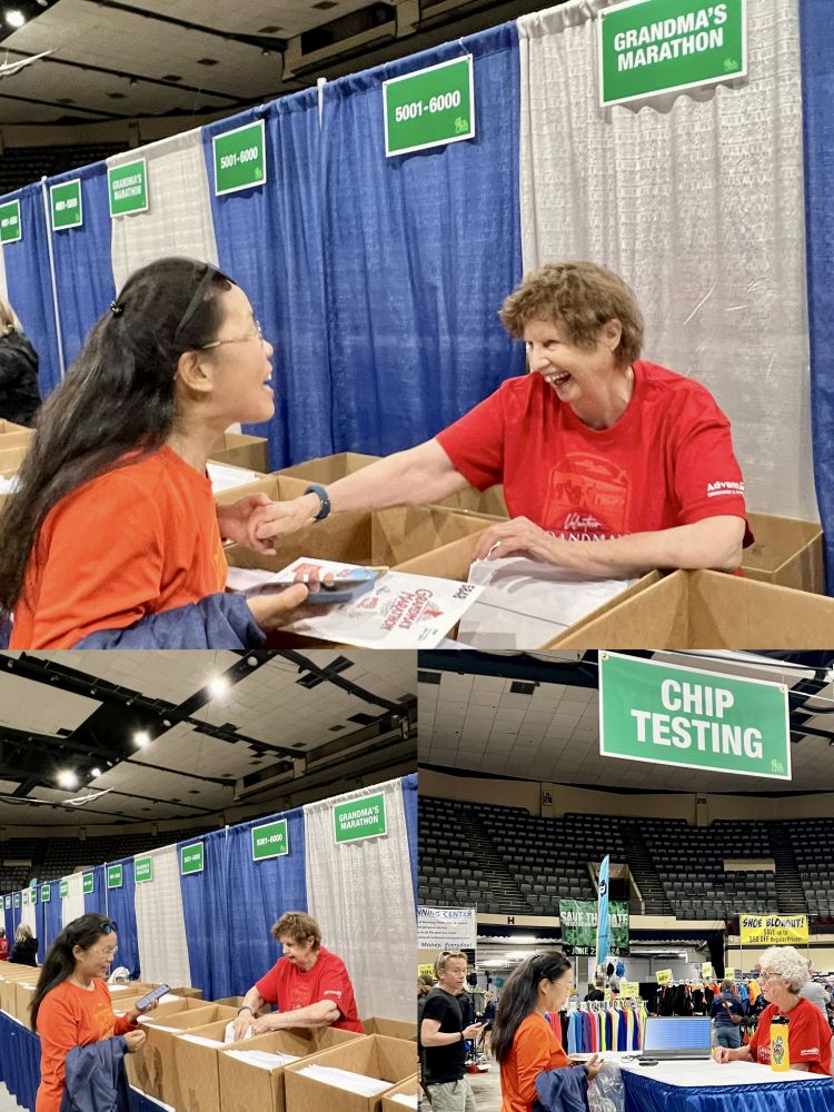 照片5: 我和先生上周四就到了Duluth,并于下午去取了参赛package。因为是奶奶/外婆马展会Expo的第一天,取参赛袋的人很少(绝大多数是在周五取),分放参赛袋的志愿者义工非常热情,与我聊了好一会儿;她是一位奶奶/外婆,我是准外婆:-)。取到参赛袋之后,还可以到一个柜台测试计时芯片记录的参赛者信息是否正确(照片5c)。