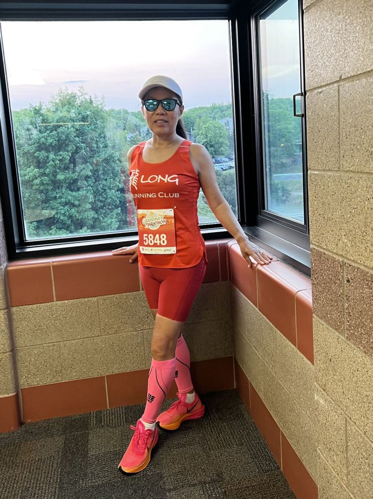照片2-3: 周五明尼苏达州华人跑团雪狼建议参赛者发定妆照,以方便第二天摄影师义工和啦啦队队员们辩认;于是,先生帮我拍了两张。