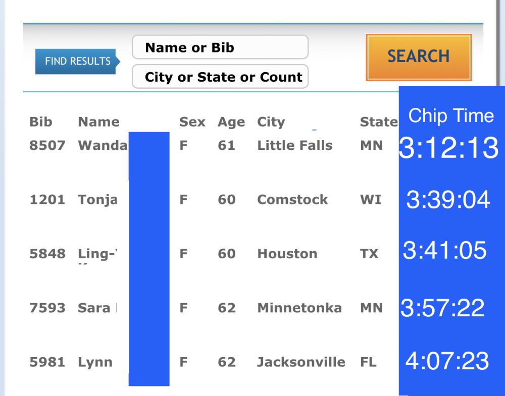 照片6: 本周六奶奶/外婆马平均完赛时间4:13:50,这是我所在的女子60-64年龄组前5名的成绩;第一名3:12:13比女子55-59年龄组第一名的3:29:14还快17分钟,amazing!正如文学城运动健身坛版主布兰雅所言,奶奶/外婆马是美国著名马拉松之一,参赛者水平很高。与女儿女婿视频通话时,我与他们分享我的纳闷:为什么这么多起伏坡的线路却有这么好的成绩?竞争这么激烈?女儿解释说也许正是因为奶奶/外婆马线路较难,并且Duluth太偏,住宿交通都不太方便,通常人们不会选择去参赛;除了居住在其周边的跑马人,从外地去跑的人大概hardcore居多;所以,整体水平较高。听女儿这么一说,我觉得挺有道理。她的老爸在一旁插话说:“一句话,来找自虐的人居多!”他的话逗得全家人哈哈大笑:-)))。
