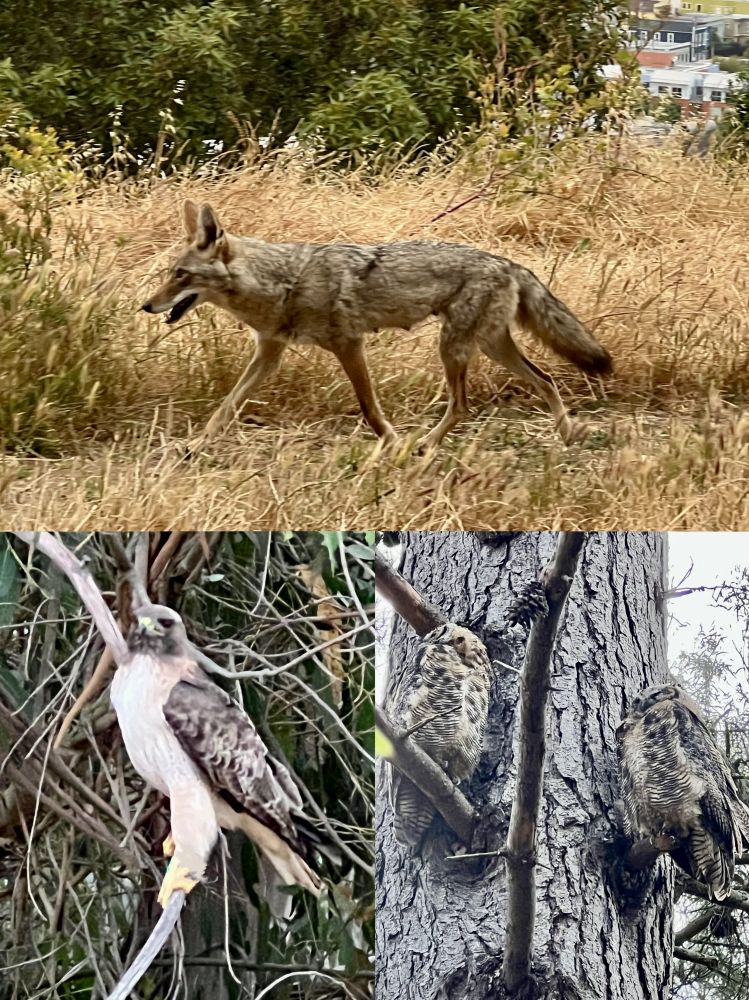 照片9: 登山漫步见到的一条土狼、一只老鹰、以及两只猫头鹰。
