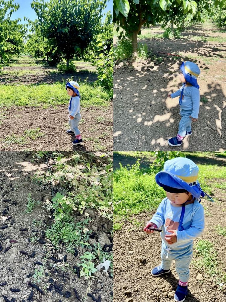 照片2: 漫步桑葚果园,看到这么多桑葚果树,宝宝无从下手,决定从树根地上拣落地的桑葚:-)。这些地上的桑葚看上去也挺不错,为什么不能吃?浪费好可惜:-)。