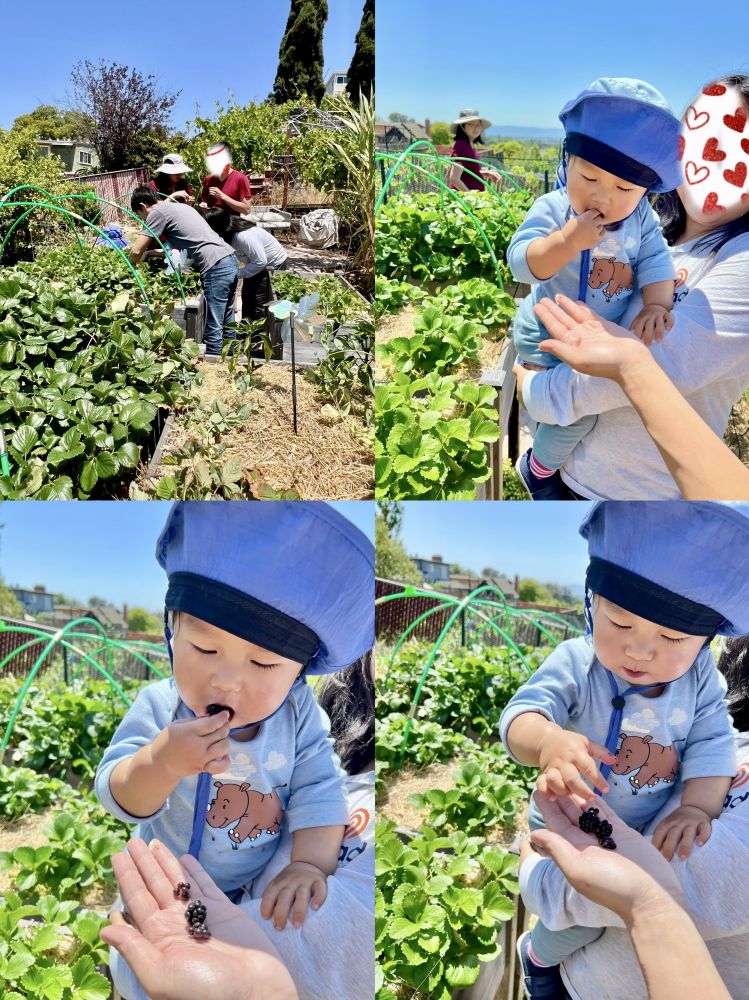午餐后,T/E夫妇和小奥带着我们在他们家的果园里品尝和摘新鲜水果。他们家果园里品种繁多,宝宝最喜欢的是摘和品尝新鲜蓝莓、草莓、黑莓、以及山莓。非常感谢T/E夫妇和小奥的盛情款待。