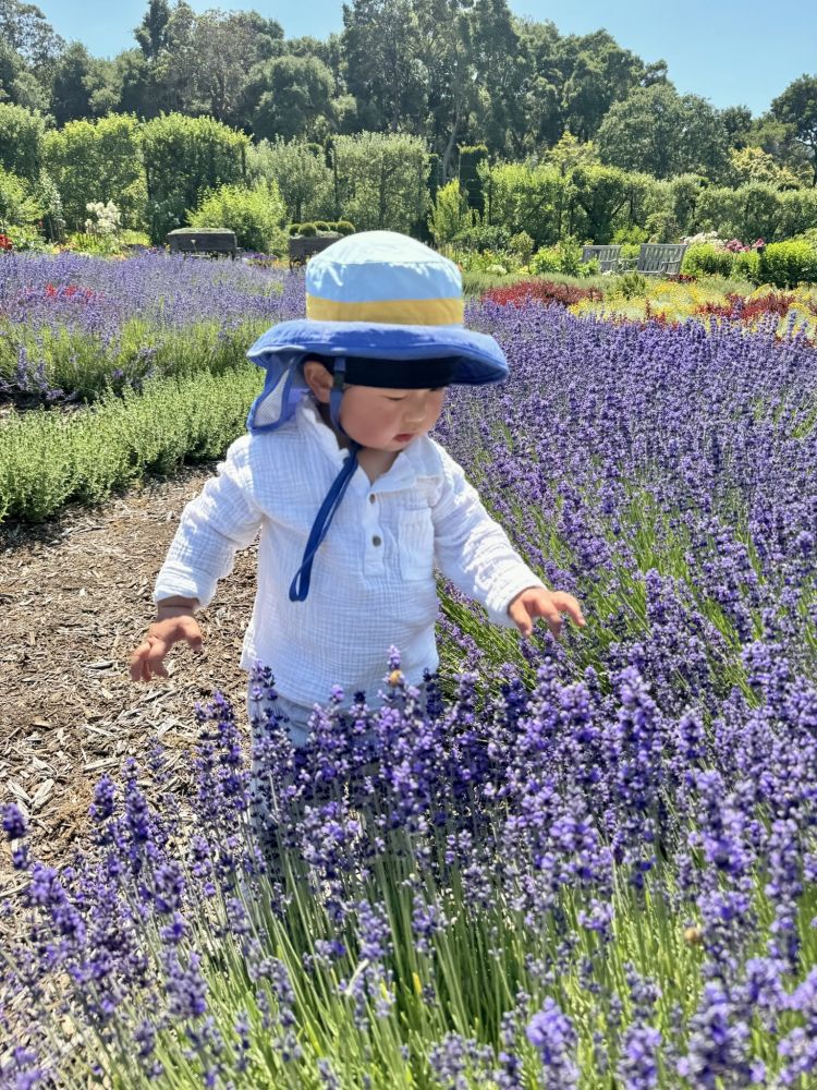 照片18-19: 我闻闻玫瑰花香和假装用手触摸薰衣草,但没有真摸。爸爸妈妈和外公外婆都告诉我要保护花草,只能用眼睛看,不能用手摸。