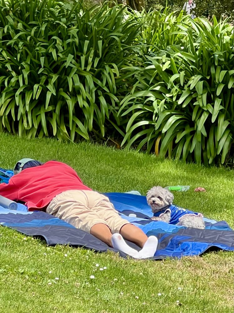 照片18: 花房前的草坪上一只小狗狗与主人一起享受日光浴:-)。
