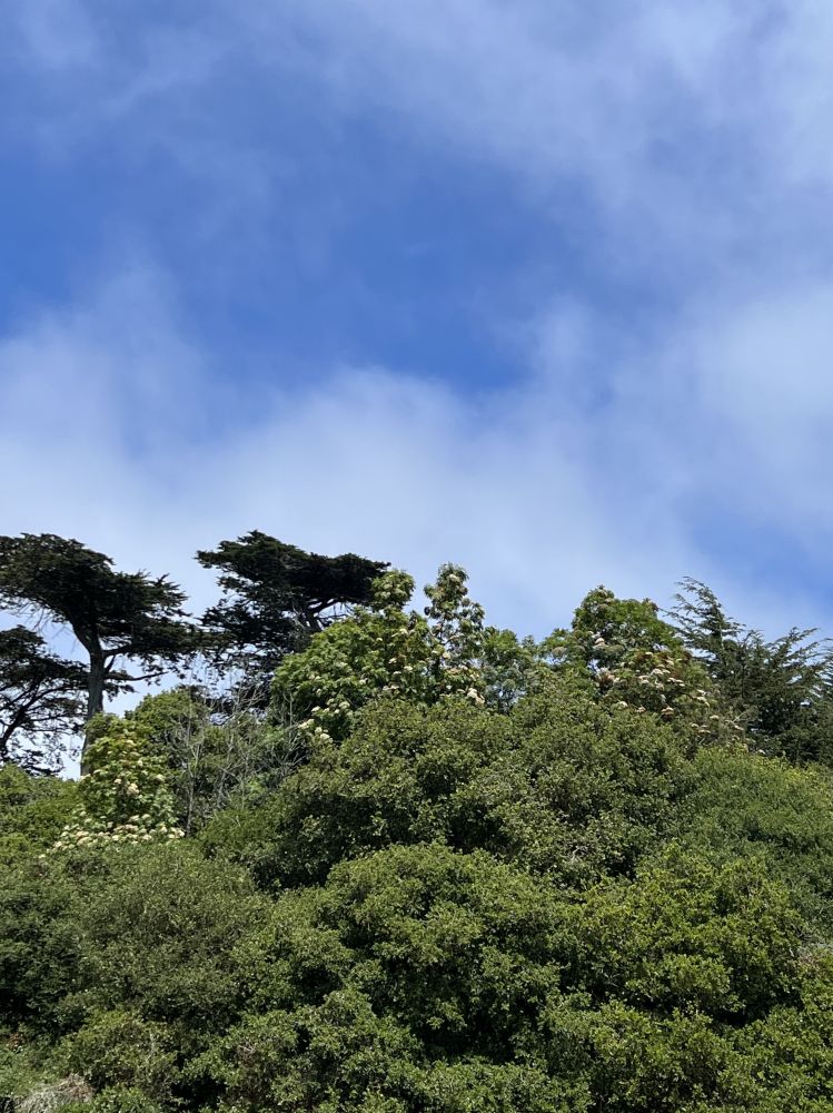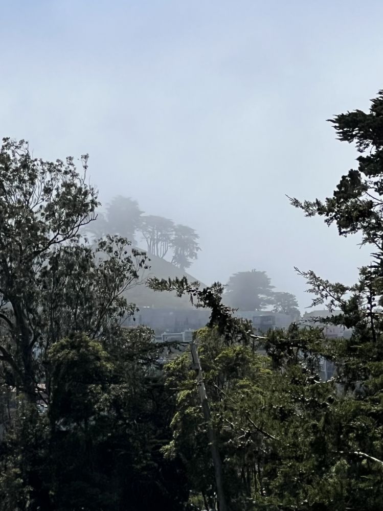 照片19-20: 漫步走向停车场时欣赏到天空奇妙的景色,临近旧金山海湾的山峦上方迷雾缭绕,弥漫的雾气逐渐消失在离海湾稍远的山峦上方。