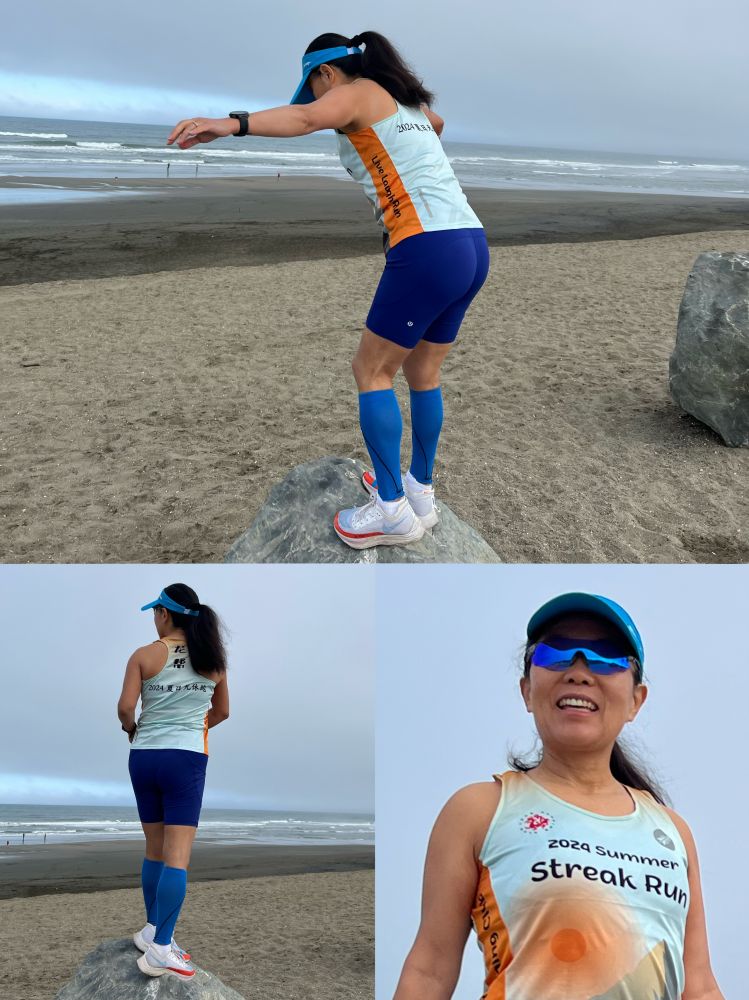 照片3: 不过,精神状况还行,不影响按惯例做起跑前站石以及与大海合影:-)。