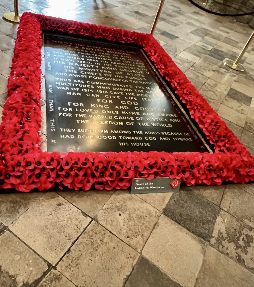 照片26: 与丘吉尔墓相邻、也是在教堂正门入口之后显著位置的是无名士兵墓。据相关介绍,这个墓里安葬的是在世界第一次世界大战中战死在法国的一位英国无名士兵的尸骨。一战期间,英军有近70万士兵在法国牺牲,长眠在那里,许多尸骨无法对上名字。1920 年,牧师大卫?瑞腾(David Railton)想起他在法国前线服务期间,曾看过一个木十字墓碑写着“无名的英国士兵”(An Unknown British Soldier),于是,他写信给威斯敏斯教堂主教,提议在教堂为无名将士留个位置,用以纪念成千上万的殉国亡灵。在得到时任主教、首相、以及国王的认同之后,1920 年 11 月 7 日晚,两位驻扎于法国暨法兰德斯战区的将官从四具牺牲在法国战场无名英国士兵的遗骨中取出一具,于11 月 9 日,遗骨被移灵到由橡树(英格兰的国树)制成的新棺木。棺木里有时任国王乔治五世(伊丽莎白女王的祖父)亲自从皇家收藏中选出的中世纪十字军所佩带的一把作为剑陪葬。1920 年 11 月 11 日,这具无名遗骨棺木被安葬在威斯敏斯教堂。据记载,在无名士兵重新安葬之后的一周,前往追思的人数以百万计,其中包括许多阵亡将士的亲属;他们以前只知自己的亲人战殁,却无尸可认,有了无名士兵墓,他们到此可探望悼想自己的亲人。这不是我第一次看到这个墓,但依然眼睛湿润了;此墓使我想起在法国重访莫奈故居时在吉维尼教堂墓园里见到纪念二战中在小镇附近被德国军队击毁的英国皇家空军兰卡斯特轰炸机七名机组成员(