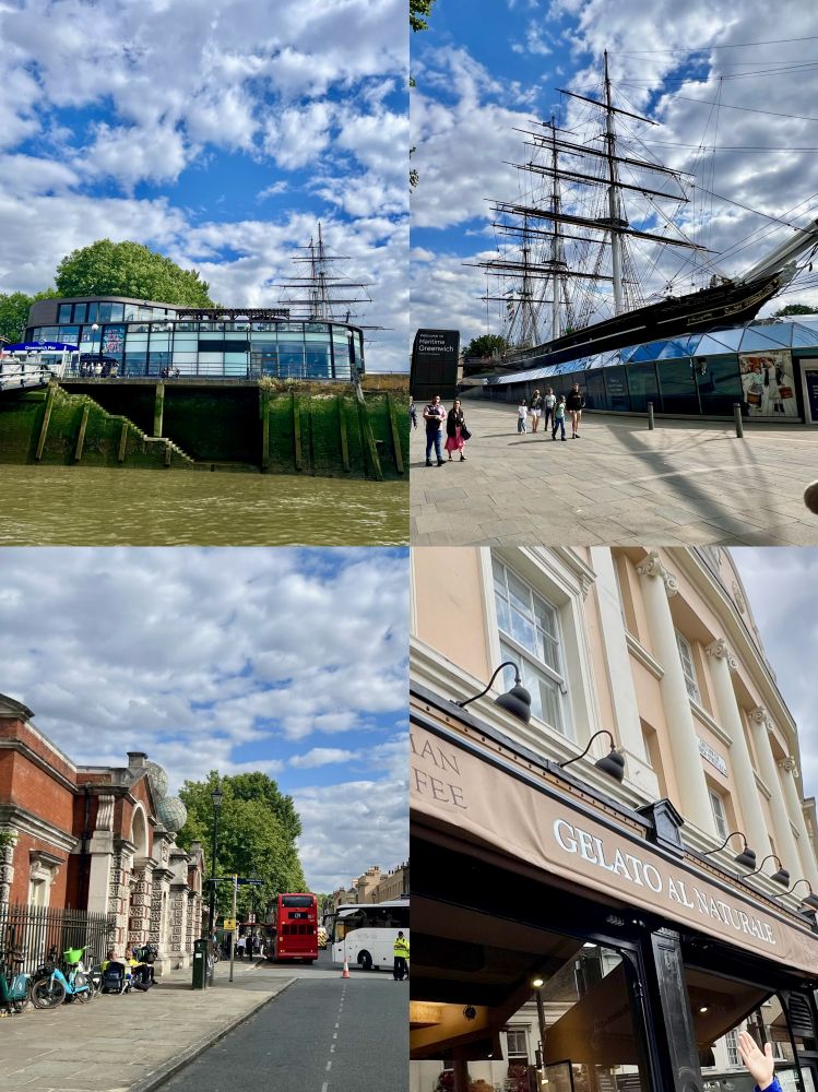 照片30: 到达格林威治码头(照片30a),上岸后很快看到了著名的Cutty Sark 号船(照片30b),这是世界上最后一艘幸存的快速帆船。是格林威治皇家博物馆的一部分,也是联合国教科文组织列为世界遗产。几年前,我陪伴宝宝外公在伦敦参加一个国际会议时,我们受邀参加了一个公司在这个船上举办的晚会。除了品尝美食美酒以及欣赏现场乐队演出,我们还有幸在格林威治皇家博物馆的带领下完整欣赏了这艘历史悠久的帆船;从中我们得知这艘船曾经是那个时代最快和最伟大的帆船,主要从事商业运营,曾经将大量的茶叶从中囤运回英。此行,我们到达时,Cutty Sark己经到了关门时间。不过,我很快被小镇上的一个意大利吉拉朵(Gelato)冰激凌店吸引:-)。