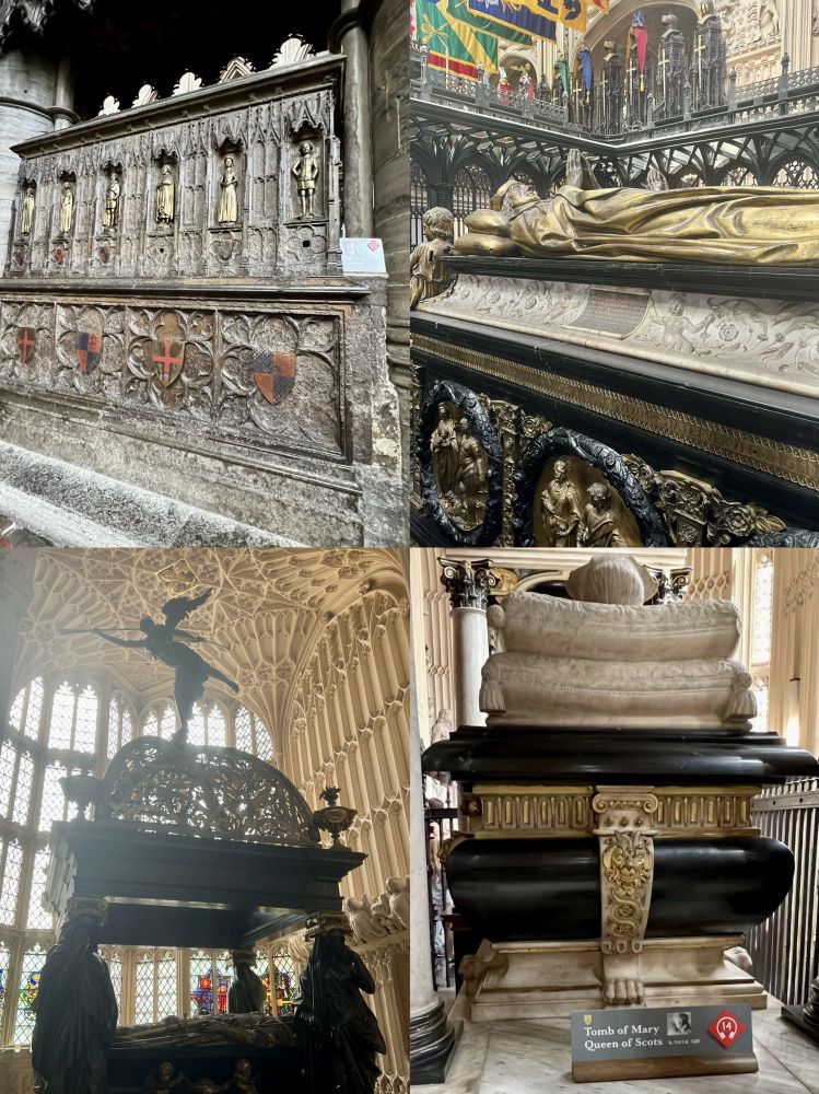照片18: 一部分英国君主之墓,照片18d 是苏格兰著名君主玛丽女王(Mary, Queen of Scots)的墓葬。苏格兰女王玛丽的一生充满悲剧色彩,虽然出生于王室,但她颠沛流离,下场凄凉,被对她既恨又怕的表亲英格兰女王伊丽莎白囚禁十九年后送上断头台处死;死后,她被葬于剑桥郡的彼得伯勒座堂,25年后,被移墓安葬在威斯敏斯特教堂。而下令处死她的那位表亲英格兰女王伊丽莎白也安葬于这座教堂,离她不远之处;都是从尘土归于尘土,令人唏嘘。