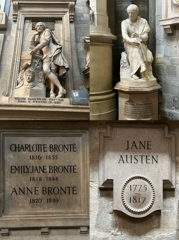 照片21: 在诗人角还有多位文坛杰出人物的纪念雕像或纪念碑,其中包括莎士比亚(William Shakespeare)、华兹华斯(William Wordsworth)、勃朗特三姐妹、以及简. 奥斯汀(Jane Austen)。他们并未安葬在威斯敏斯特教堂,我和宝宝外公这些年来有幸探访过他们的出生地、故居、以及安息之地,其中一部分还写过相关游记,分别是
