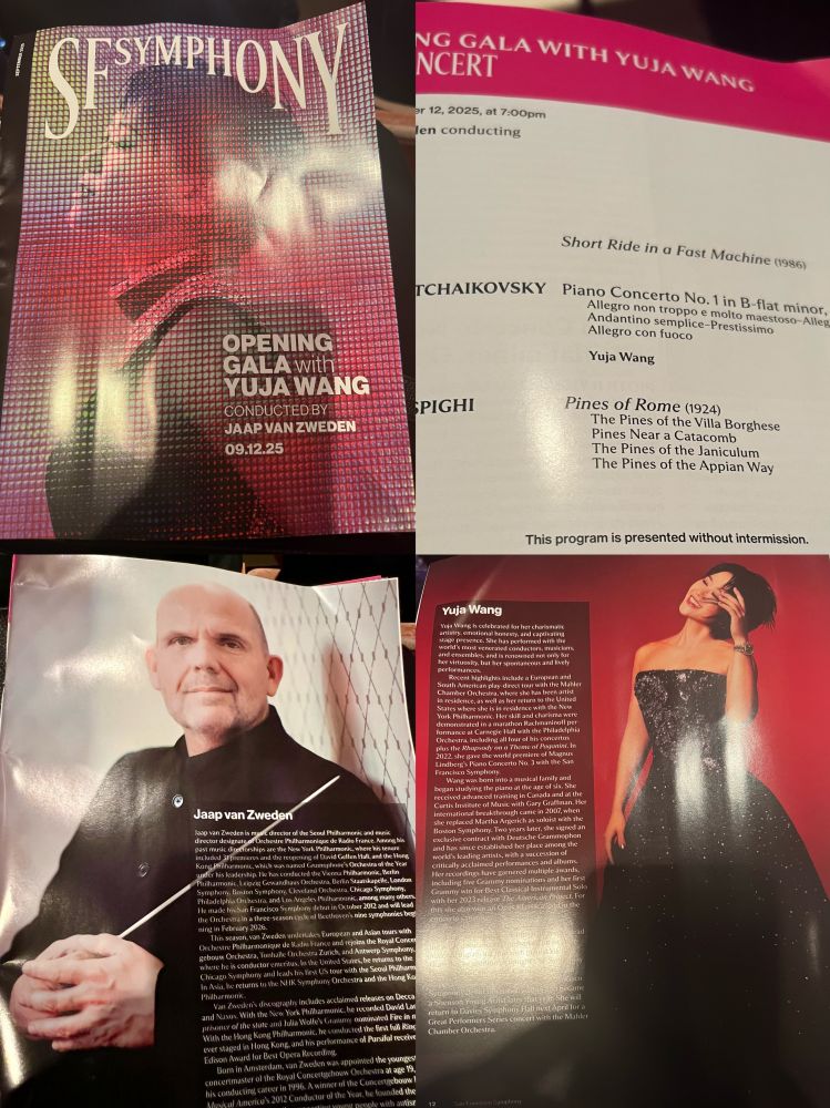 照片1: 旧金山交响乐团 2025-2026音乐会新年度的开幕晚会杂志的封面,音乐会节目介绍,以及对指挥家和钢琴演奏家的介绍,分别是荷兰指挥家和小提琴家雅普·梵志登(Jaap van Zweden)以及美籍华商钢琴演奏家王羽佳(Yuja Wang)。
