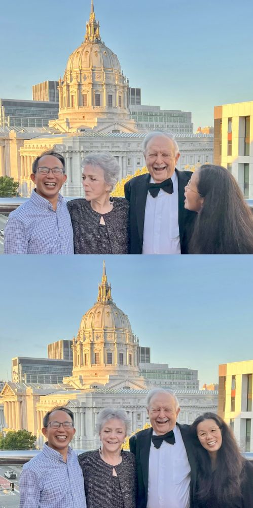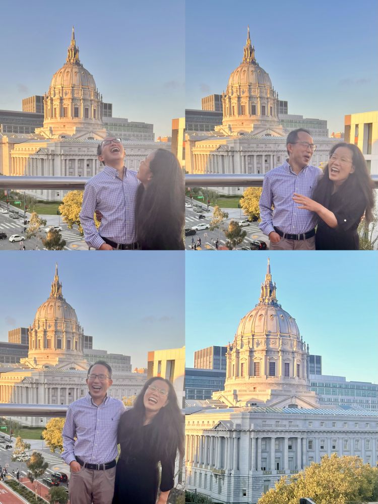 照片6-7: 也非常感谢那对老人家的外孙女主动提议为我们夫妇拍的这些照片。这位漂亮活泼的年轻人对我们夫妇的中规中矩拍照姿势“不满意”,建议在38周年结婚纪念日浪漫一些,她的外祖父母则提议我们亲吻一个,引得大家哈哈大笑,留下下许多欢乐的瞬间。注:背景建筑是旧金山市政厅。