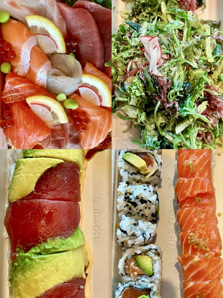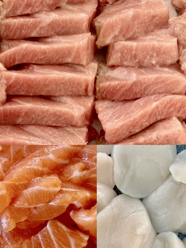 照片8-11: 这次出月子第一次恢复长跑跑得很愉快,与丰富的营养密不可分。感谢女儿女婿的好友J/D夫妇以及家人邀请我们全家周六去他们家共进丰盛的晚餐(照片8-10),中西餐搭配(新鲜鲔鱼鱼片、三文鱼鱼片、海贝、羊排、肉圆、柠檬鸡),荤素搭配,使得我次日长跑有使不完的劲:-)。感谢女儿女婿买的我很喜欢的日式海鲜补充蛋白质和碳水(照片11),